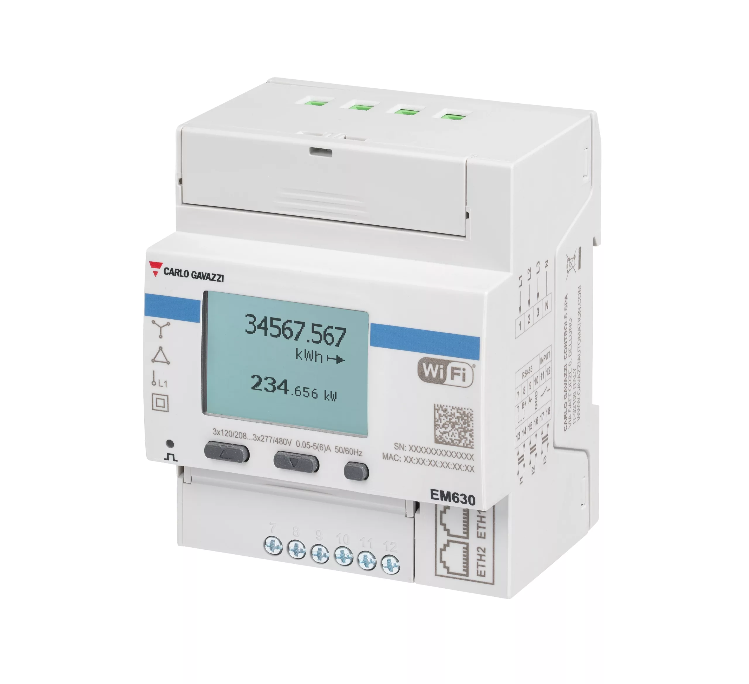 EM630 è un analizzatore di energia per sistemi monofase, bifase e trifase fino a 480 V L-L.