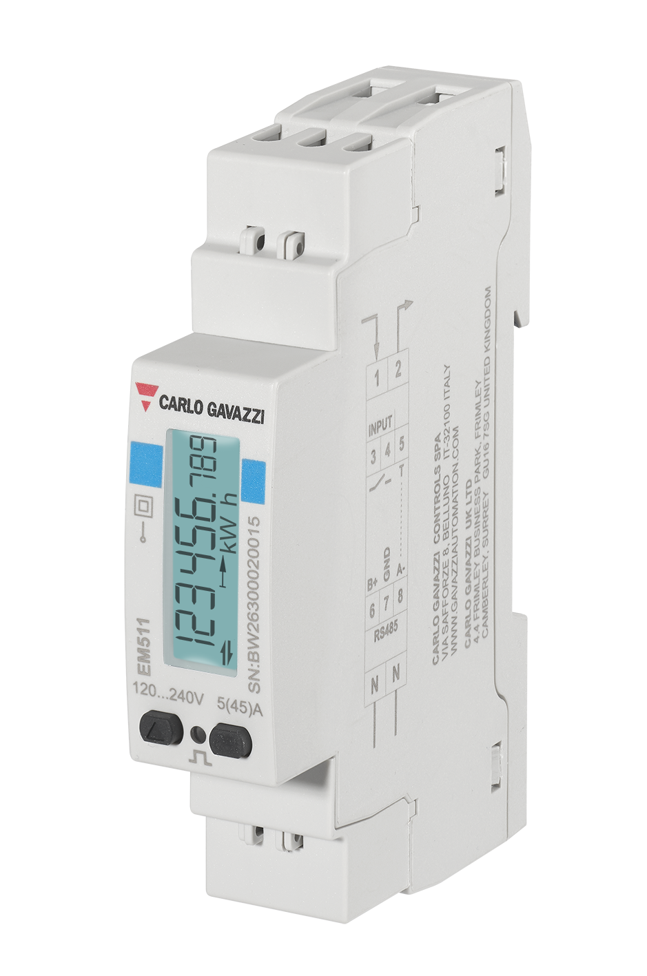 EM511 è un analizzatore di energia per sistemi monofase fino a 240 V L-N e 45 A.