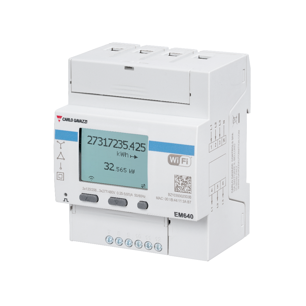 EM640 è un analizzatore di energia a connessione diretta per sistemi monofase, bifase e trifase fino a 480 V L-L e 65 A.