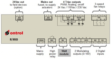 Il modulo R-MIO costituisce l’interfaccia compatta tra il campo (I/O) e i controllori d’ambiente touch-screen programmabili della serie R-ION. Questa combinazione semplifica notevolmente l’installazione a parete (es. il modulo I/O può essere posizionato vicino all’unità controllata, limitando il cablaggio al solo cavo di comunicazione con l’unità a parete). La disponibilità di più versioni evita di dover predisporre ulteriori alimentatori o trasformatori, riducendo ulteriormente i costi e il lavoro di installazione.